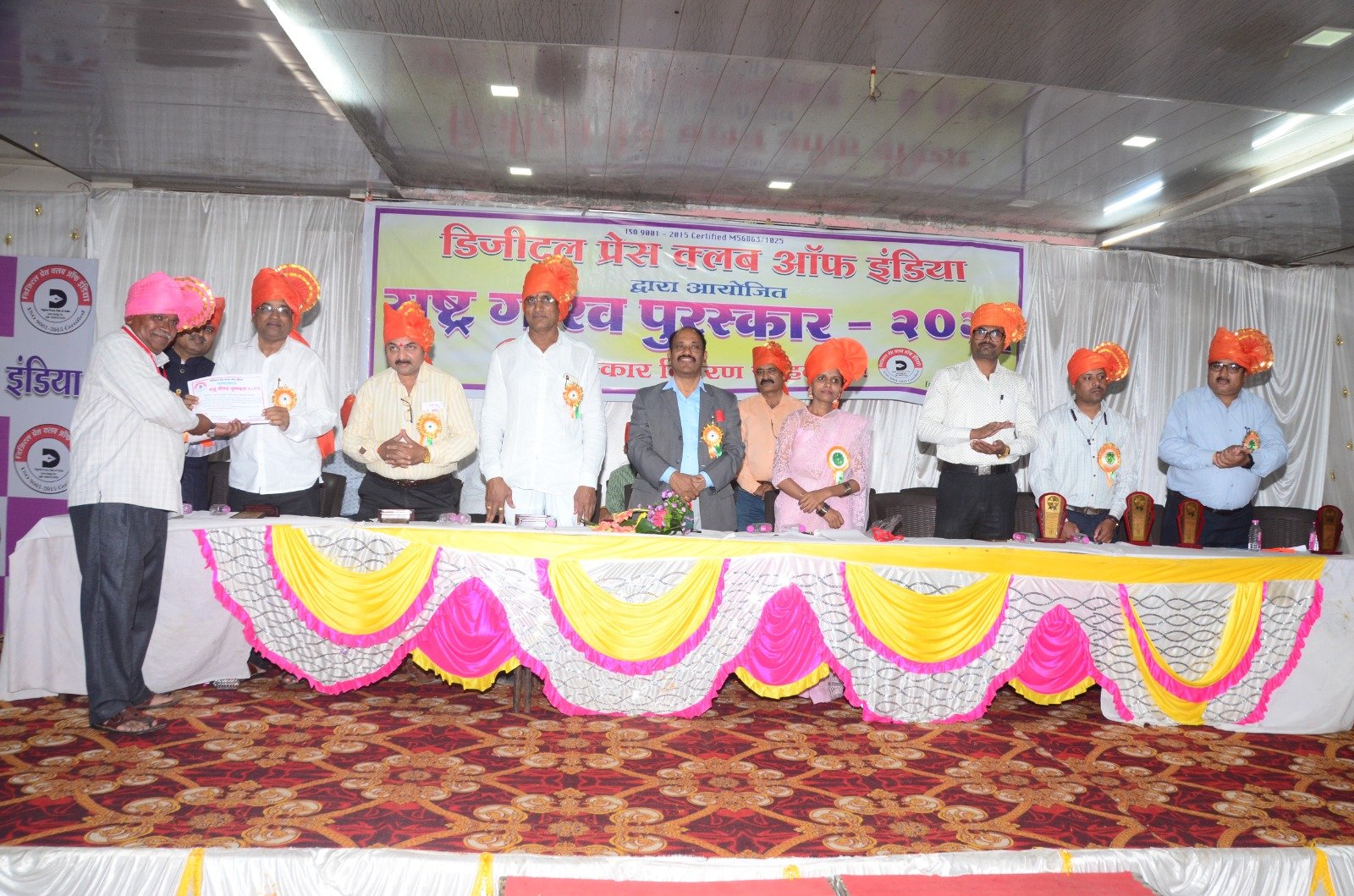 राष्ट्र गौरव पुरस्कार वितरण कार्यक्रमाच्या अध्यक्षस्थानी डॉ. प्रा. अनिल खर्चे (प्राचार्य व्ही. बी. कोलते इंजीनियरिंग कॉलेज) , कार्यक्रमाचे उद्घाटक ब्रह्मानंदजी जाधव मुख्य संपादक दैनिक महाभुमी, तर प्रमुख पाहुणे संजयजी काजळे सभापती कृषी उत्पन्न बाजार समिती , धनश्रीताई काटीकर पाटील महाराष्ट्र