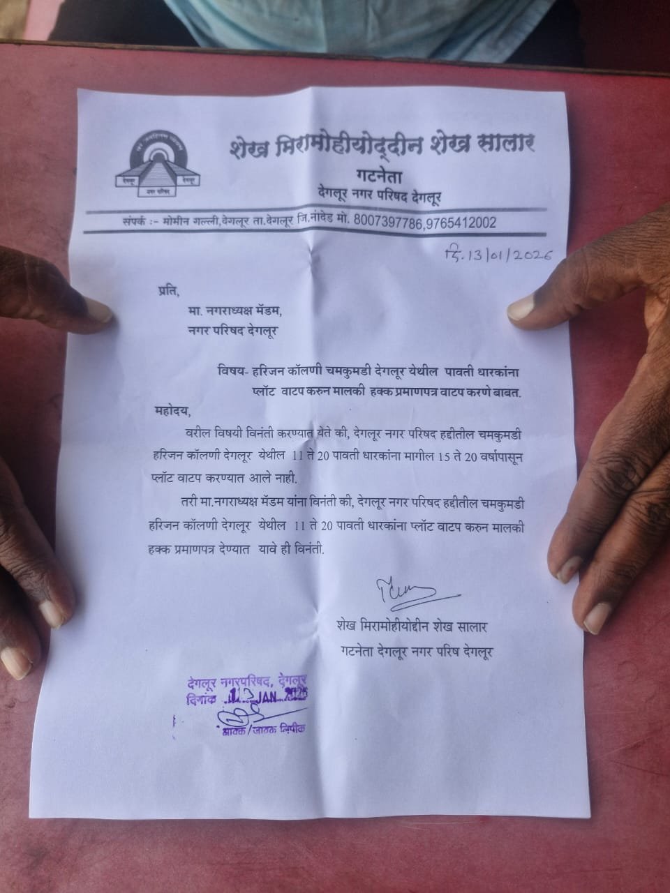 देगलूर प्रतिनिधी दि.१३:- देगलूर नगरपरिषदेच्या मुख्याधिकारी श्रीमती नीलम कांबळे यांना काँग्रेस पक्षाचे गटनेते शेख मीरामयोद्दीन यांच्या नेतृत्वाखाली नगरसेवक व त्यांच्या प्रतिनिधींनी चमकुमडी परिसरातील हरिजन कॉलनीतील ११ पावतीधारकांना तात्काळ प्लॉट वाटप करण्यात यावे, अशी जोरदार मागणी करत निवेदन दिले.