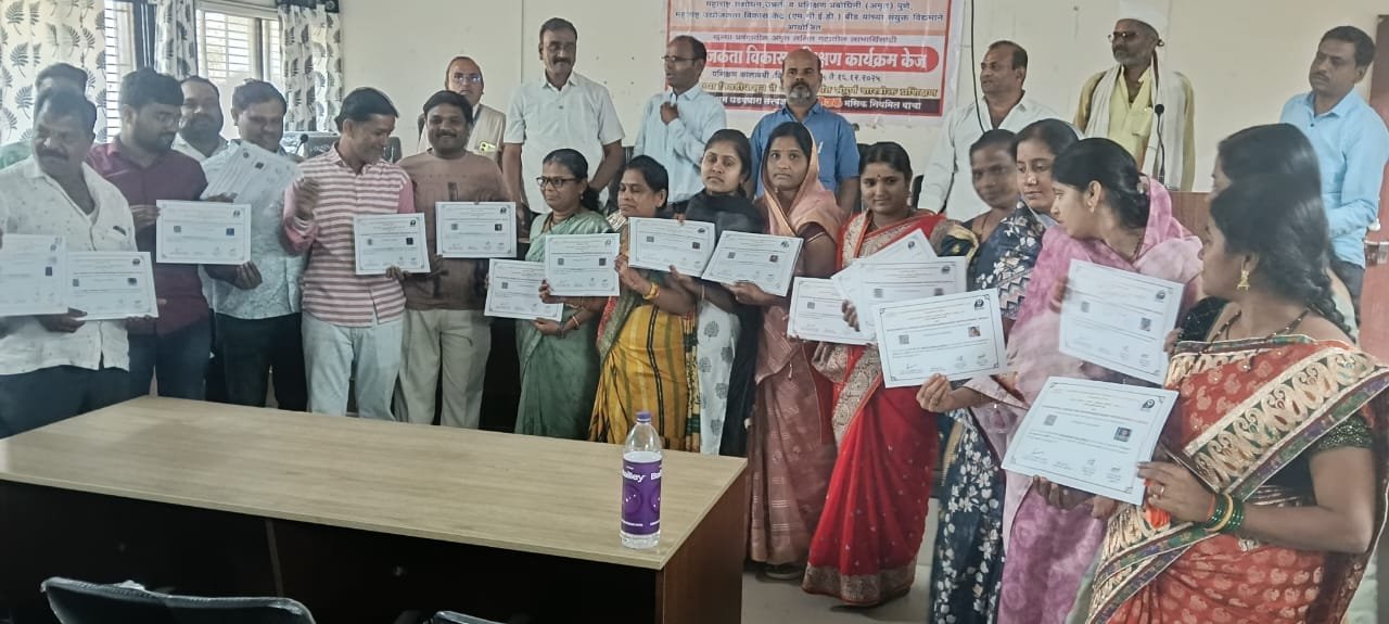 व्यवस्थापक श्री.सर्जेराव जाधव साहेब,वैद्यनाथ सहकारी बँकेचे संचालक प्रवीण देशपांडे,भारतीय जनता मजदूर संघाचे महाराष्ट्र प्रदेश सचिव धनंजय कुलकर्णी आदी मान्यवर उपस्थित होते. केज पंचायत समितीच्या सभागृहात झालेल्या उद्योजकता विकास प्रशिक्षण शिबिराच्या लाभार्थ्यांना प्रमाणपत्र वितरणाचा कार्यक्रम झाला.