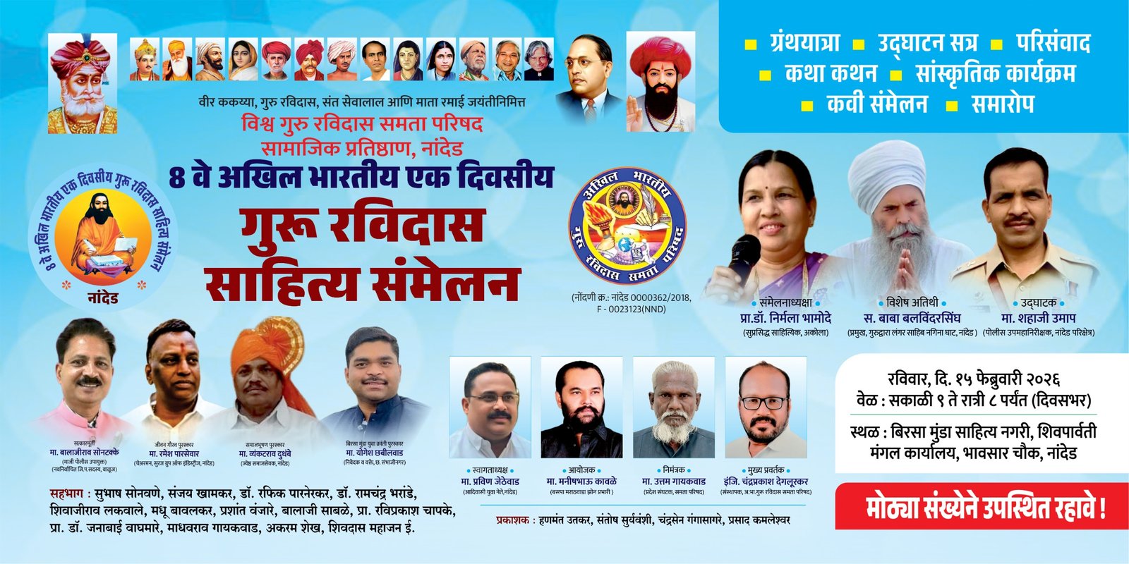 नांदेडमध्ये १५ फेब्रुवारीला आठवे अखिल भारतीय गुरु रविदास साहित्य संमेलन; दिवसभर भरगच्च साहित्यिक व सांस्कृतिक कार्यक्रम.